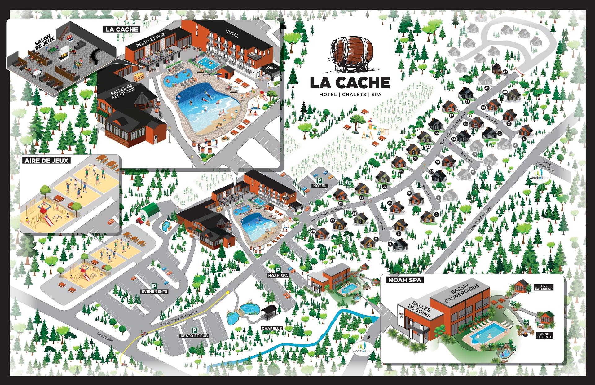 Découvrez notre complexe hôtelier qui comprend 47 suites, 30 chalets en location, un Noah Spa, un Resto et un Pub!